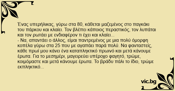Ένας υπερήλικας, γύρω στα 80, κάθεται μαζεμένος στο παγκάκι του πάρκου και κλαίει. Τον βλέπει κάποιος περαστικός, τον λυπάται και τον ρωτάει με ενδιαφέρον τι έχει και κλαίει...