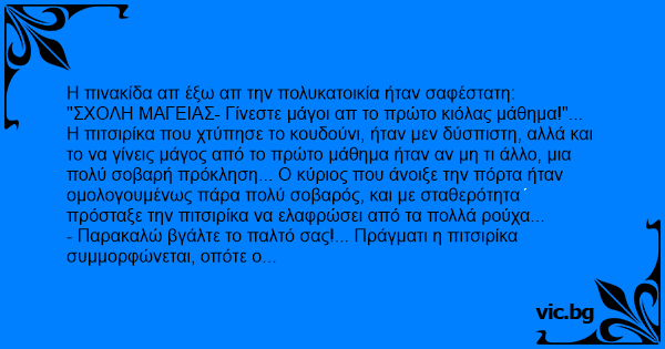 "ΣΧΟΛΗ ΜΑΓΕΙΑΣ- Γίνεστε μάγοι απ το πρώτο κιόλας μάθημα!"... Η πιτσιρίκα που χτύπησε το κουδούνι, ήταν μεν δύσπιστη, αλλά και το να γίνεις μάγος από το πρώτο μάθημα ήταν αν μη τι άλλο, μια πολύ σοβαρή πρόκληση... Ο κύριος που άνοιξε την πόρτα ήταν ομολογουμένως πάρα πολύ σοβαρός, και με σταθερότητα πρόσταξε την πιτσιρίκα να ελαφρώσει από τα πολλά ρούχα...