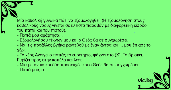 Μία καθολική γυναίκα πάει να εξομολογηθεί. (Η εξομολόγηση στους καθολικούς ναούς γίνεται σε κλειστά παραβάν με διαφορετική είσοδο του παπά και του πιστού).