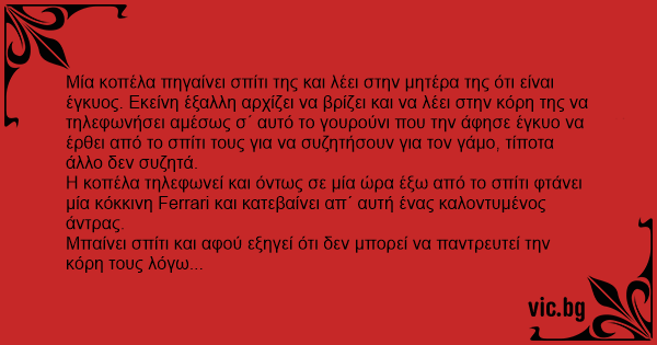 Η κοπέλα τηλεφωνεί και όντως σε μία ώρα έξω από το σπίτι φτάνει μία κόκκινη Ferrari και κατεβαίνει απ΄ αυτή ένας καλοντυμένος άντρας.