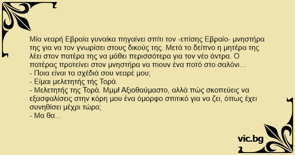 - Μελετητής της Τορά. Μμμ! Αξιοθαύμαστο, αλλά πώς σκοπεύεις να εξασφαλίσεις στην κόρη μου ένα όμορφο σπιτικό για να ζει, όπως έχει συνηθίσει μέχρι τώρα;