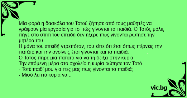 Η μάνα του επειδή ντρεπόταν, του είπε ότι έτσι όπως πέρνεις την πατάτα και την ανοίγεις έτσι γίνονται και τα παιδιά.
