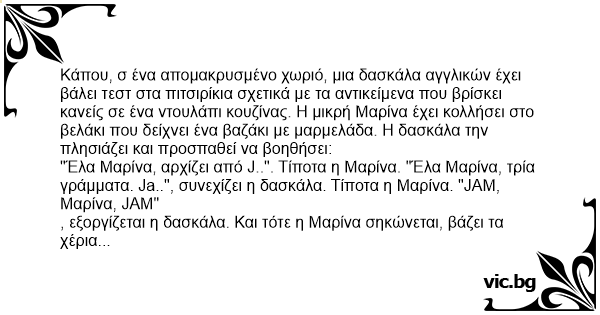 "Έλα Μαρίνα, αρχίζει από J..". Τίποτα η Μαρίνα. "Έλα Μαρίνα, τρία γράμματα. Ja..", συνεχίζει η δασκάλα. Τίποτα η Μαρίνα. "JAM, Μαρίνα, JAM"