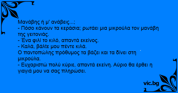 - Πόσο κάνουν τα κεράσια; ρωτάει μια μικρούλα τον μανάβη της γειτονιάς.