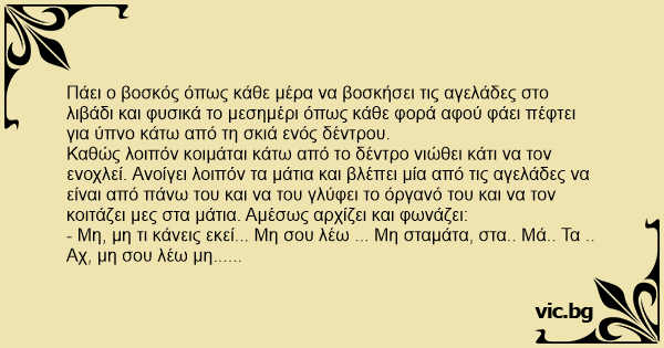 Καθώς λοιπόν κοιμάται κάτω από το δέντρο νιώθει κάτι να τον ενοχλεί. Ανοίγει λοιπόν τα μάτια και βλέπει μία από τις αγελάδες να είναι από πάνω του και να του γλύφει το όργανό του και να τον κοιτάζει μες στα μάτια. Αμέσως αρχίζει και φωνάζει: