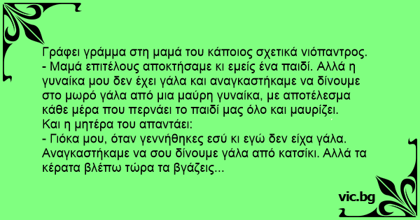 - Μαμά επιτέλους αποκτήσαμε κι εμείς ένα παιδί. Αλλά η γυναίκα μου δεν έχει γάλα και αναγκαστήκαμε να δίνουμε στο μωρό γάλα από μια μαύρη γυναίκα, με αποτέλεσμα κάθε μέρα που περνάει το παιδί μας όλο και μαυρίζει.