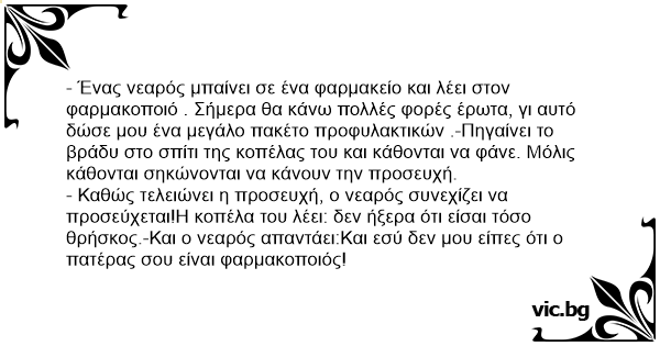 - Ένας νεαρός μπαίνει σε ένα φαρμακείο και λέει στον φαρμακοποιό . Σήμερα θα κάνω πολλές φορές έρωτα, γι αυτό δώσε μου ένα μεγάλο πακέτο προφυλακτικών .-Πηγαίνει το βράδυ στο σπίτι της κοπέλας του και κάθονται να φάνε. Μόλις κάθονται σηκώνονται να κάνουν την προσευχή.