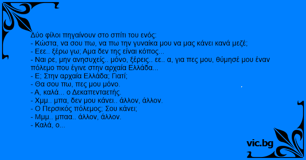 - Ναι ρε, μην ανησυχείς.. μόνο, ξέρεις.. εε.. α, για πες μου, θύμησέ μου έναν πόλεμο που έγινε στην αρχαία Ελλάδα...