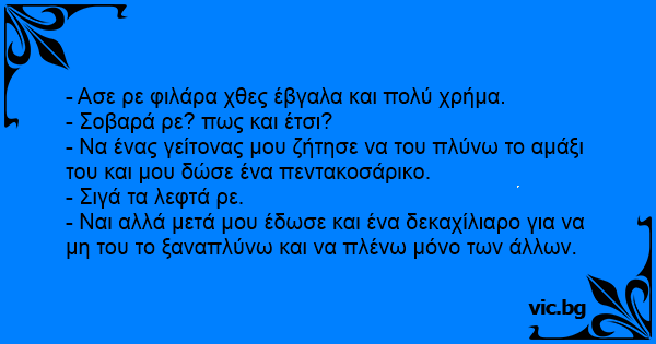 - Ναι αλλά μετά μου έδωσε και ένα δεκαχίλιαρο για να μη του το ξαναπλύνω και να πλένω μόνο των άλλων.