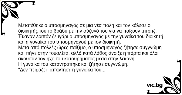 "Δεν πειράζει" απάντησε η γυναίκα του διοικητή "Είναι η πρώτη φορά όλο το βράδυ που ξέρω τι κρατάει στο χέρι του."