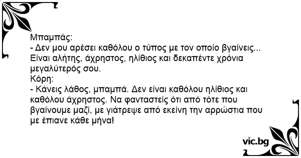 - Κάνεις λάθος, μπαμπά. Δεν είναι καθόλου ηλίθιος και καθόλου άχρηστος. Να φανταστείς ότι από τότε που βγαίνουμε μαζί, με γιάτρεψε από εκείνη την αρρώστια που με έπιανε κάθε μήνα!