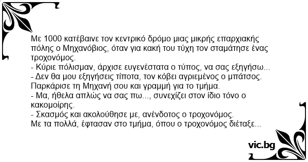 Με 1000 κατέβαινε τον κεντρικό δρόμο μιας μικρής επαρχιακής πόλης ο Μηχανόβιος, όταν για κακή του τύχη τον σταμάτησε ένας τροχονόμος.