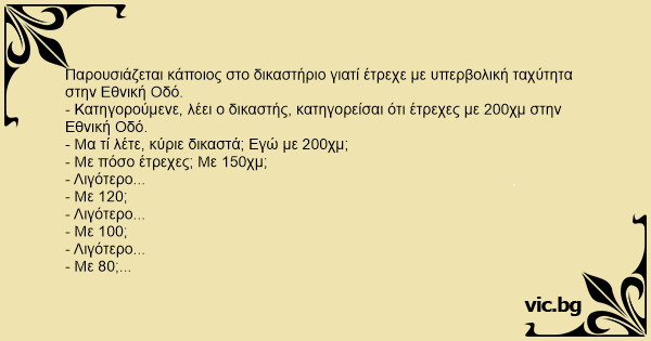 - Κατηγορούμενε, λέει ο δικαστής, κατηγορείσαι ότι έτρεχες με 200χμ στην Εθνική Οδό.