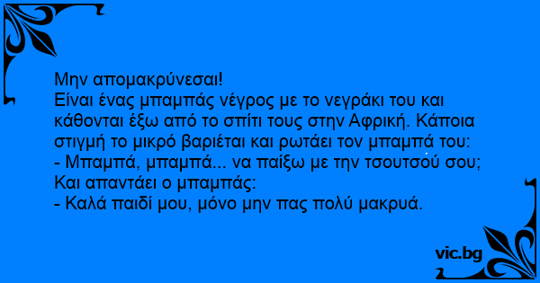 Είναι ένας μπαμπάς νέγρος με το νεγράκι του και κάθονται έξω από το σπίτι τους στην Αφρική. Κάποια στιγμή το μικρό βαριέται και ρωτάει τον μπαμπά του:
