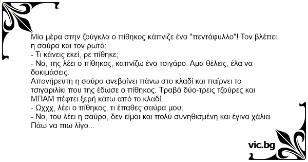 - Να, της λέει ο πίθηκος, καπνίζω ένα τσιγάρο. Αμα θέλεις, έλα να δοκιμάσεις.