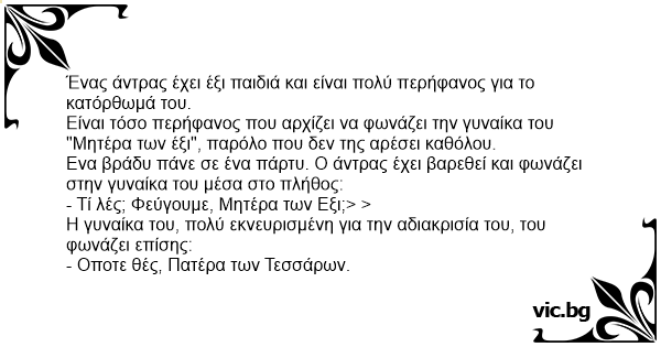 Гости Mad Mother-of-Six El chiste de la madre de siete There once was a man who was so proud of the fact that he had six kids that he insisted on calling his wife "mother of six." Ein Mann hat sechs Kinder und ist sehr stolz auf seine Leistung. Er ist so stolz, dass er anfängt seine Frau "Mutter von Sechs" zu nennen , trotz ihrer Einwände. Eines Abends gehen sie auf eine... Едно семейство имало шест деца. Башата бил толкова горд,че спрял да нарича жена си по име, а й казвал: "майко на шест деца". Веднъж отишли на театър, но в антракта се изгубили. Застанал мъжът на... A husband, who has six children, begins to call his wife “mother of six” rather than by her first name. The wife, amused at first, chuckles. A few years down the road, the wife has grown tired of... O maior orgulho de Evaldo era sua prole: seis filhos! Vivia tão cheio de si que passou a chamar a mulher de Mãe-de-Seis, apesar dos protestos dela, que odiava o apelido. Uma noite, no aniversário... Un uomo, mentre e’ in casa con i suoi amici, chiama la moglie e dice: “Madre di cinque figli portaci da bere”. La donna gli porta da bere. E l’uomo: “Grazie, madre di 5 figli”. E la donna: “Prego,... Mor til seks En mand og hans kone havde fået fem børn og ventede et Sjette, hvilket manden var ret stolt af. Da det sjette barn var ankommet gav han sin kone øgenavnet "mor til seks". En aften da... Een man heeft 6 kinderen en is trots op zijn prestatie. Hij is zo trots op zichzelf dat hij zijn vrouw 'moeder van 6' noemt, ondanks haar protest. Op een avond, gaan ze naar een feest. De man... En mann har seks barn og er veldig stolt over hva han har oppnådd. Han er så fornøyd at han begynner å kalle sin kone for "mor til seks", på tross av hennes innsigelser. En kveld var de ute i et...