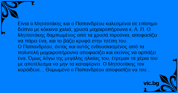 Είναι ο Μητσοτάκης και ο Παπανδρέου καλεσμένοι σε επίσημο δείπνο με κόκκινα χαλιά, χρυσά μαχαιροπήρουνα κ. Λ. Π. Ο Μητσοτάκης θαμπωμένος από τα χρυσά πιρούνια, αποφασίζει να πάρει ένα, και το βάζει κρυφά στην τσέπη του.