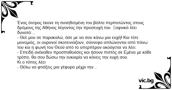 Ένας άντρας έκανε τη συνηθισμένη του βόλτα περπατώντας στους δρόμους της Αθήνας λέγοντας την προσευχή του. Ξαφνικά λέει δυνατά:...