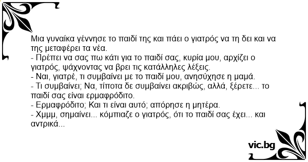 - Τι συμβαίνει; Να, τίποτα δε συμβαίνει ακριβώς, αλλά, ξέρετε... το παιδί σας είναι ερμαφρόδιτο.