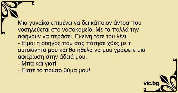 - Είμαι η οδηγός που σας πάτησε χθες με τ αυτοκίνητό μου και θα ήθελα να μου γράψετε μια αφιέρωση στην άδειά μου.