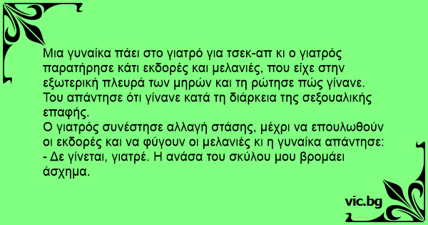 Μια γυναίκα πάει στο γιατρό για τσεκ-απ κι ο γιατρός παρατήρησε κάτι εκδορές και μελανιές, που είχε στην εξωτερική πλευρά των μηρών και τη ρώτησε πώς γίνανε. Του απάντησε ότι γίνανε κατά τη διάρκεια της σεξουαλικής επαφής.