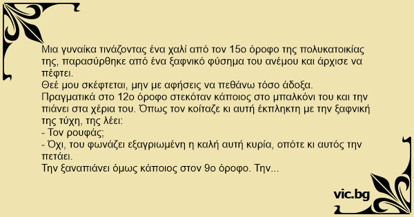Πραγματικά στο 12ο όροφο στεκόταν κάποιος στο μπαλκόνι του και την πιάνει στα χέρια του. Όπως τον κοίταζε κι αυτή έκπληκτη με την ξαφνική της τύχη, της λέει: