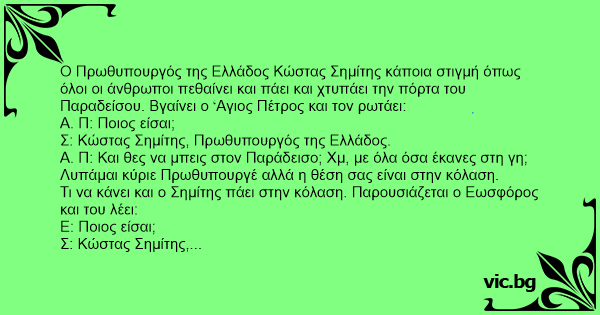Ο Πρωθυπουργός της Ελλάδος Κώστας Σημίτης κάποια στιγμή όπως όλοι οι άνθρωποι πεθαίνει και πάει και χτυπάει την πόρτα του Παραδείσου. Βγαίνει ο Aγιος Πέτρος και τον ρωτάει: