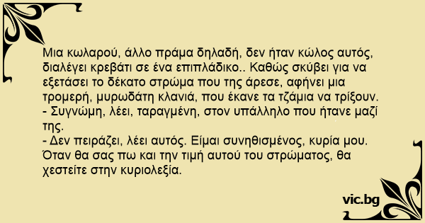 - Δεν πειράζει, λέει αυτός. Είμαι συνηθισμένος, κυρία μου. Όταν θα σας πω και την τιμή αυτού του στρώματος, θα χεστείτε στην κυριολεξία.