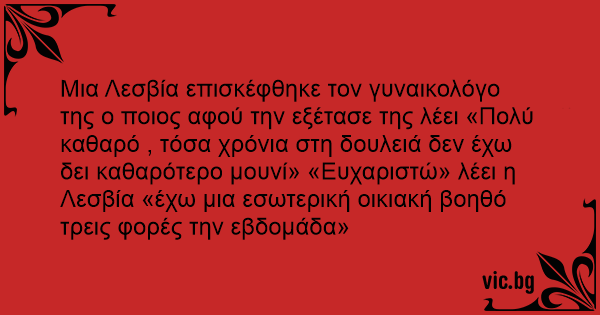Μια Λεσβία επισκέφθηκε τον γυναικολόγο της ο ποιος αφού την εξέτασε της λέει «Πολύ καθαρό , τόσα χρόνια στη δουλειά δεν έχω δει καθαρότερο μουνί» «Ευχαριστώ» λέει η Λεσβία «έχω μια εσωτερική οικιακή βοηθό τρεις φορές την εβδομάδα»