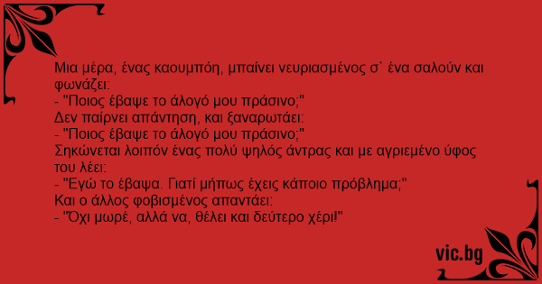 Ένας κοντός cowboy, γύρω στο 1.60, μπαίνει αγριεμένος στο σαλούν και χτυπώντας το χέρι του στο μπαρ ουρλιάζει: - Ποιός από εσάς ρε, έβαψε το άλογό μου πράσινο; Τότε πετάγεται ένας τύπος γύρω στα...