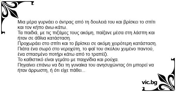 Τη βρήκε στην κρεβατοκάμαρα, να διαβάζει ένα βιβλίο. Τον κοίταξε και τον ρώτησε πώς ήταν η μέρα στη δουλειά. Αυτός την κοίταξε απορημένος και της λέει :