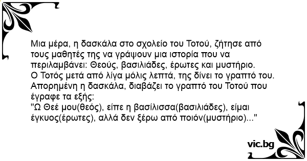 Ο Τοτός μετά από λίγα μόλις λεπτά, της δίνει το γραπτό του. Απορημένη η δασκάλα, διαβάζει το γραπτό του Τοτού που έγραφε τα εξής: