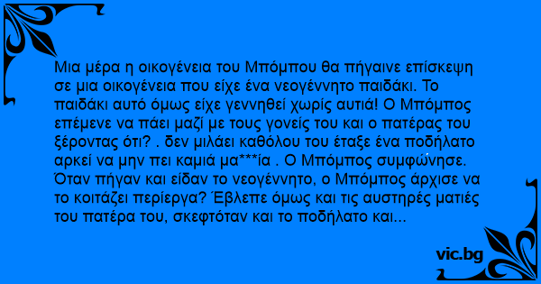Μια μέρα η οικογένεια του Μπόμπου θα πήγαινε επίσκεψη σε μια οικογένεια που είχε ένα νεογέννητο παιδάκι. Το παιδάκι αυτό όμως είχε γεννηθεί χωρίς αυτιά! Ο Μπόμπος επέμενε να πάει μαζί με τους γονείς του και ο πατέρας του ξέροντας ότι? . δεν μιλάει καθόλου του έταξε ένα ποδήλατο αρκεί να μην πει καμιά μα***ία . Ο Μπόμπος συμφώνησε.