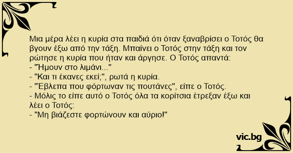 Μάζεψε μια μέρα όλα τα κορίτσια της τάξης και είπε η δασκάλα: «κορίτσια επειδή έρχεται ο επιθεωρητής στο σχολείο μας αν ο Τοτός πει καμία άσχημη μπροστά στον επιθεωρητή να ουρλιάζετε σαν τρελές και να τρέξετε έξω από την τάξη». Πάει την άλλη μέρα ο επιθεωρητής και ελέγχει τις τάξεις και μπαίνει...