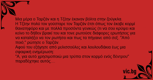 Όταν η Τζέιν πρωτογνώρισε τον Ταρζάν, ένιωσε μια έλξη και εκεί που τoν ρωτούσε για τη ζωή του, τον ρώτησε και πως έκανε σεξ. - «Ταρζάν δεν ξέρει τι είναι αυτό», της απάντησε. Η Τζέιν του εξήγησε τι...