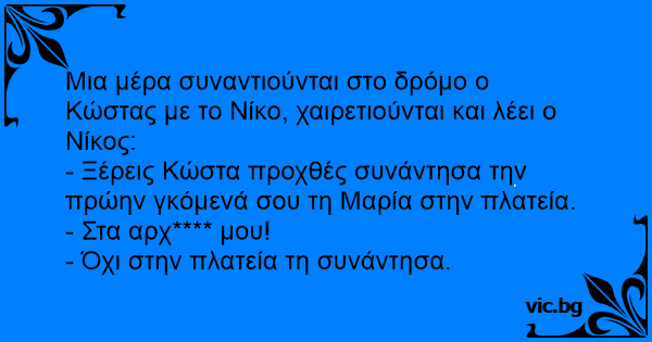 - Ξέρεις Κώστα προχθές συνάντησα την πρώην γκόμενά σου τη Μαρία στην πλατεία.