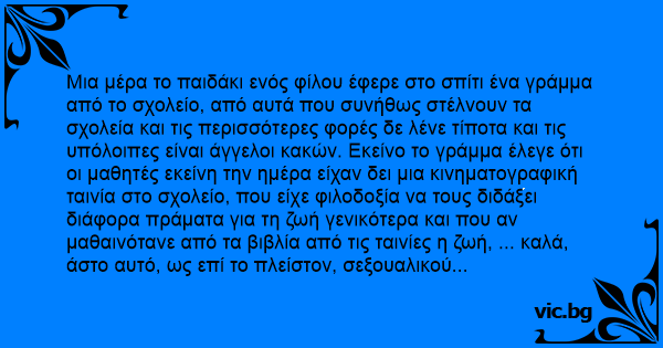 Μια μέρα το παιδάκι ενός φίλου έφερε στο σπίτι ένα γράμμα από το σχολείο, από αυτά που συνήθως στέλνουν τα σχολεία και τις περισσότερες φορές δε λένε τίποτα και τις υπόλοιπες είναι άγγελοι κακών. Εκείνο το γράμμα έλεγε ότι οι μαθητές εκείνη την ημέρα είχαν δει μια κινηματογραφική ταινία στο σχολείο, που είχε φιλοδοξία να τους διδάξει διάφορα πράματα για τη ζωή γενικότερα και που αν μαθαινότανε από τα βιβλία από τις ταινίες η ζωή, ... καλά, άστο αυτό, ως επί το πλείστον, σεξουαλικού περιεχομένου, (σεξουαλική αγωγή κλπ, ξέρετε εσείς, που ούτε κι αυτά μαθαίνονται από τις ταινίες. Πρακτική χρειάζεται!) Έδινε δε οδηγίες στους γονείς να ρωτήσουν τα παιδάκια τους αν είχαν τίποτα απορίες για το περιεχόμενο της ταινίας. Πιστός στις επιταγές του σχολείου, ο φίλος μου πήρε το διστακτικό γιο του στο σαλόνι κι άρχισε την... ανάκριση:
