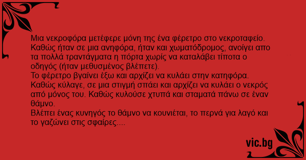 Μια νεκροφόρα μετέφερε μόνη της ένα φέρετρο στο νεκροταφείο. Καθώς ήταν σε μια ανηφόρα, ήταν και χωματόδρομος, ανοίγει απο τα πολλά τραντάγματα η πόρτα χωρίς να καταλάβει τίποτα ο οδηγός (ήταν μεθυσμένος βλέπετε).