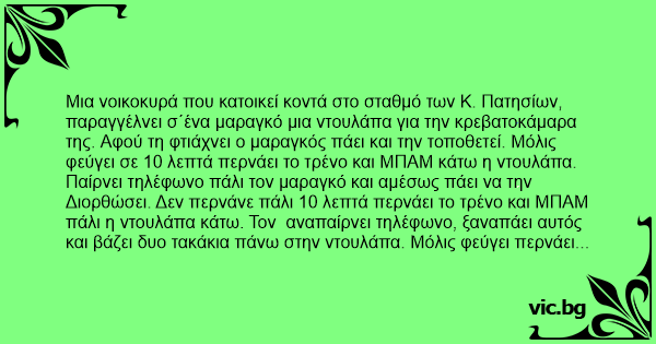 Διορθώσει. Δεν περνάνε πάλι 10 λεπτά περνάει το τρένο και ΜΠΑΜ πάλι η ντουλάπα κάτω. Τον αναπαίρνει τηλέφωνο, ξαναπάει αυτός και βάζει δυο τακάκια πάνω στην ντουλάπα. Μόλις φεύγει περνάει πάλι το τρένο πάρτην κάτω πάλι την ντουλάπα. Παίρνει πάλι τηλέφωνο τον μαραγκό, και αγανακτισμένος αυτός της