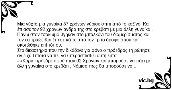 Μια νύχτα μια γυναίκα 87 χρόνων γύρισε σπίτι από το καζίνο, Και έπιασε τον 92 χρόνων άνδρα της στο κρεβάτι με μια άλλη γυναίκα .