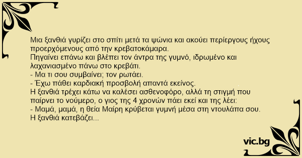 - Μαμά, μαμά, η θεία Μαίρη κρύβεται γυμνή μέσα στη ντουλάπα σου.