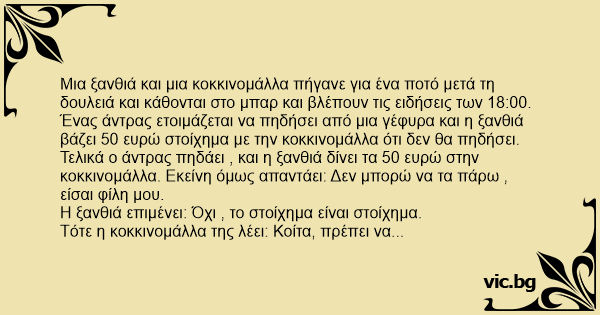 Τελικά ο άντρας πηδάει , και η ξανθιά δίνει τα 50 ευρώ στην κοκκινομάλλα. Εκείνη όμως απαντάει: Δεν μπορώ να τα πάρω , είσαι φίλη μου.