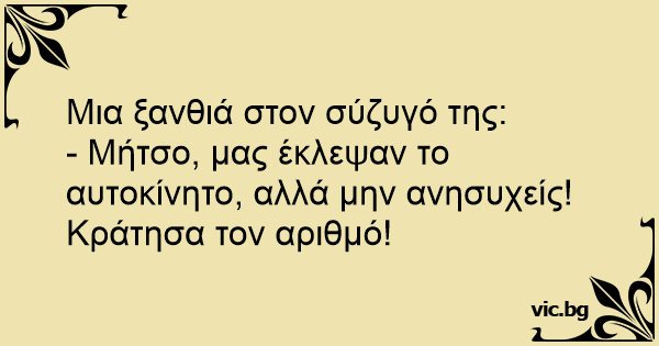 - Μήτσο, μας έκλεψαν το αυτοκίνητο, αλλά μην ανησυχείς! Κράτησα τον αριθμό!