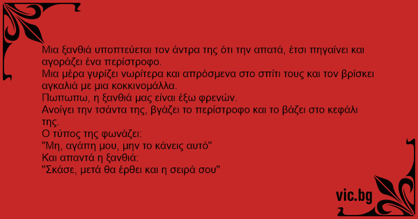 Μια μέρα γυρίζει νωρίτερα και απρόσμενα στο σπίτι τους και τον βρίσκει αγκαλιά με μια κοκκινομάλλα.