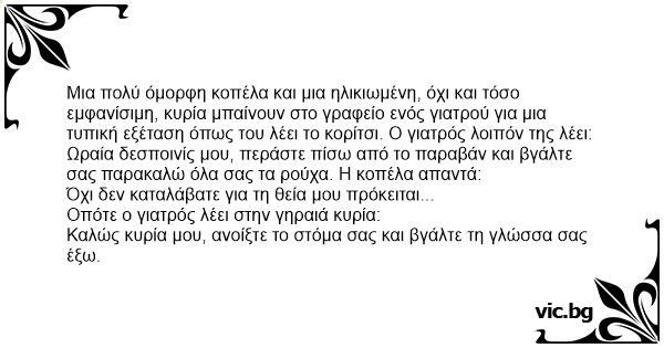 Μια πολύ όμορφη κοπέλα και μια ηλικιωμένη, όχι και τόσο εμφανίσιμη, κυρία μπαίνουν στο γραφείο ενός γιατρού για μια τυπική εξέταση όπως του λέει το κορίτσι. Ο γιατρός λοιπόν της λέει: