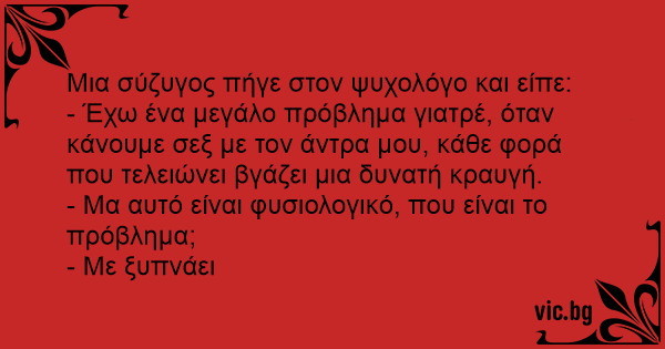 - Έχω ένα μεγάλο πρόβλημα γιατρέ, όταν κάνουμε σεξ με τον άντρα μου, κάθε φορά που τελειώνει βγάζει μια δυνατή κραυγή.