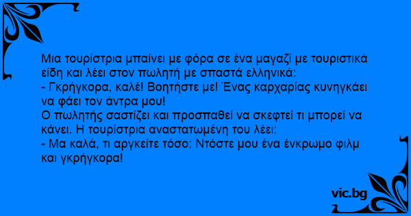 Μια τουρίστρια μπαίνει με φόρα σε ένα μαγαζί με τουριστικά είδη και λέει στον πωλητή με σπαστά ελληνικά: