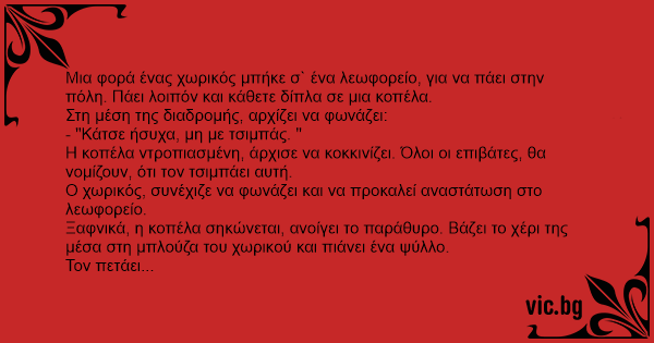 Μια φορά ένας χωρικός μπήκε σ` ένα λεωφορείο, για να πάει στην πόλη. Πάει λοιπόν και κάθετε δίπλα σε μια κοπέλα.