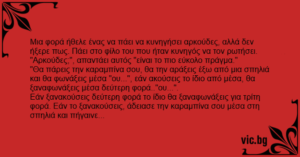 Μια φορά ήθελε ένας να πάει να κυνηγήσει αρκούδες, αλλά δεν ήξερε πως. Πάει στο φίλο του που ήταν κυνηγός να τον ρωτήσει.