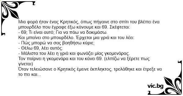 Όταν τελειώσανε ο Κρητικός έμεινε έκπληκτος, τρελάθηκε και έτρεξε να το πει και στους φίλους του. Τους λέει λοιπόν τι έγινε και πόσο πολύ τους άρεσε, και τρέξανε όλοι να κάνουν 69. Τότε πήγε και ο Μανωλάς. Μπαίνει στο μπουρδέλο και λέει στη γριά.